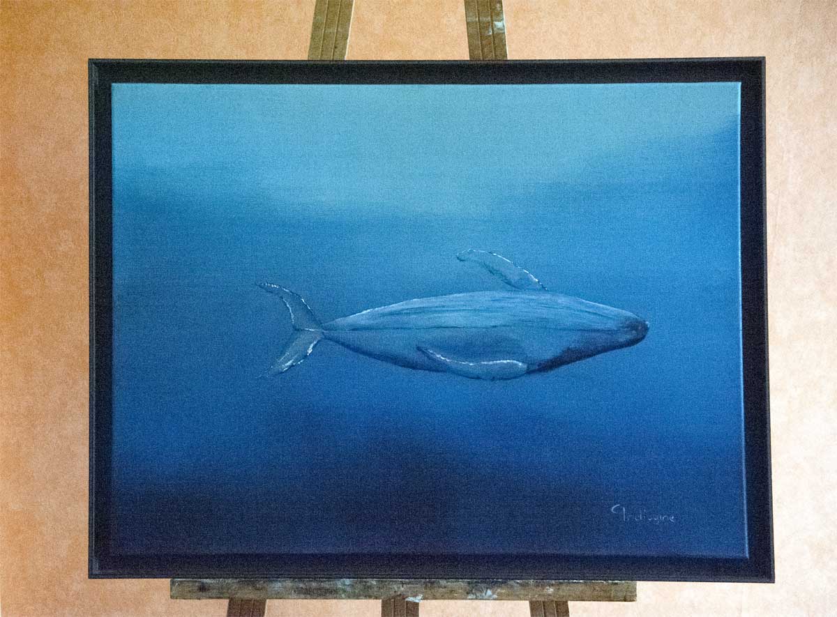 Back in Nice I felt a real necessity to paint this encounter. On canvas, with the fluidity of oil, I was able to reproduce the nuances of the blues and the depths, like an immersion in the ocean. On paper, the fluidity of watercolour allowed me to fix with a certain lightness these majestic presences in a few moments.