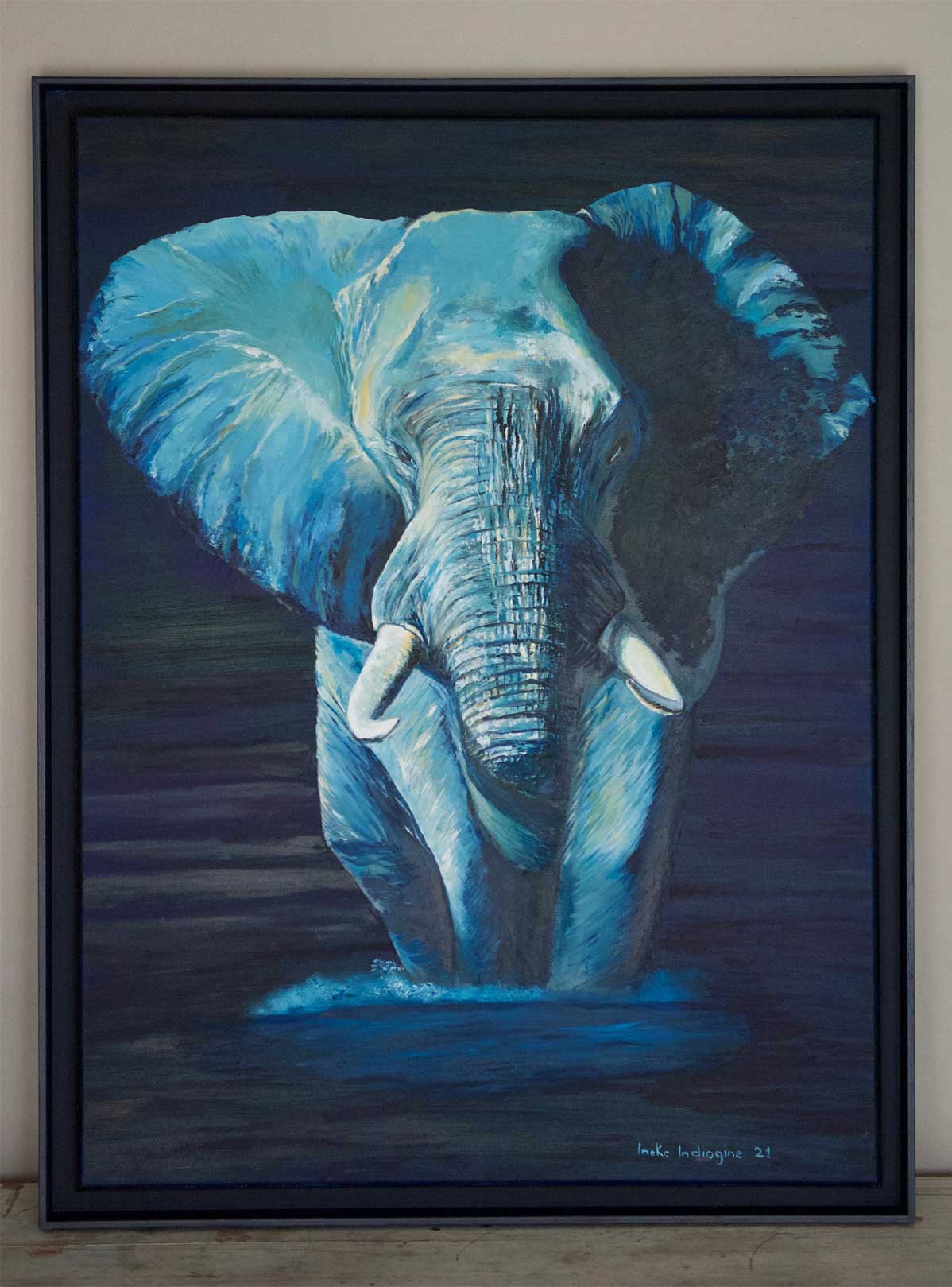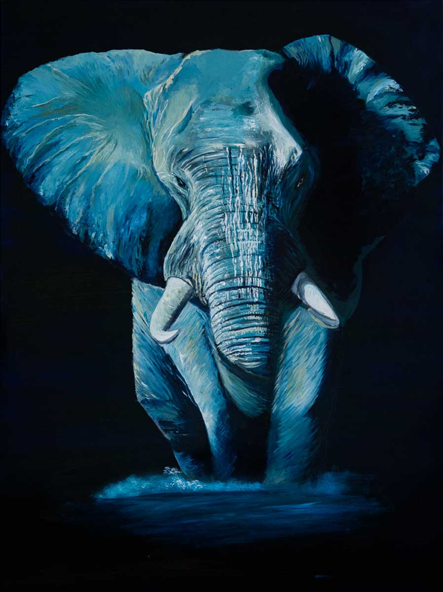 Nuances de bleu pour cet éléphant qui surgit avec majesté d’une profondeur mystérieuse en lui donnant une impression surréelle.