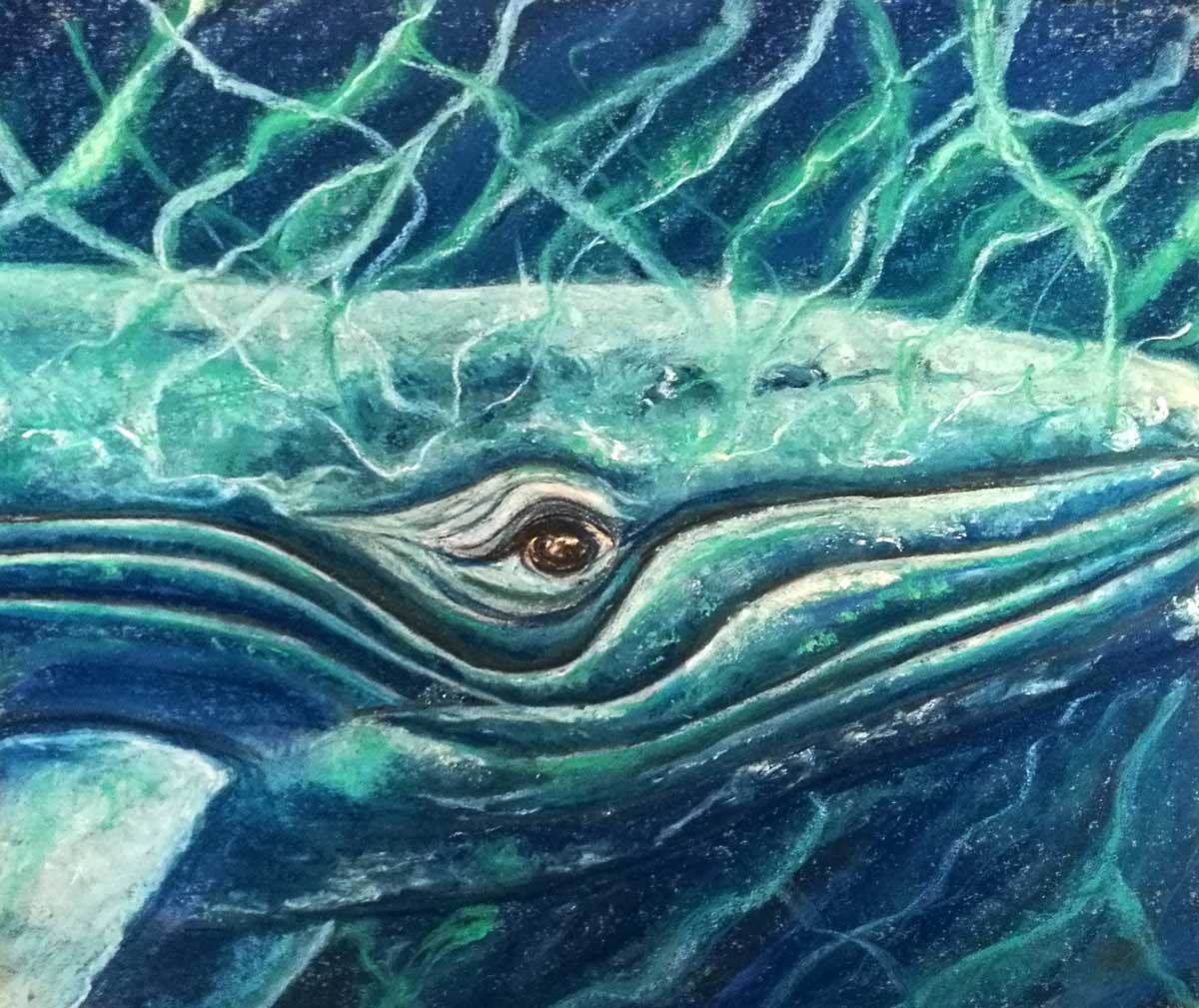 Playing with the colours to represent the eye full of wisdom and tranquillity of the whale. The reflections in the water make the stillness of the moment dance.